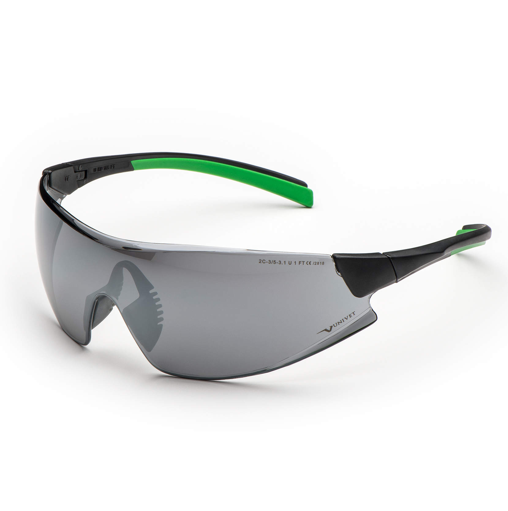 Farbe des Glases: dunkel Farbe des Rahmens: schwarz/grün Eigenschaften: Anti-Beschlag, hart beschichtet, UV Kennzeichnung des Glases: 2C-3/5-3.1 U 1 FT Kennzeichnung des Rahmens: FT Norm: EN166, EN170, EN172