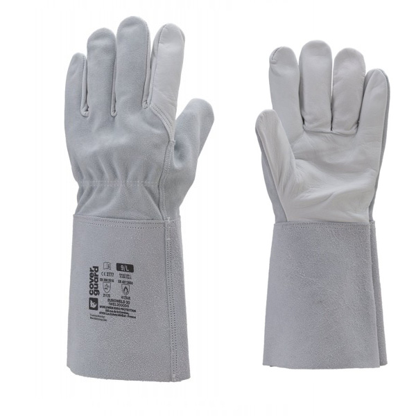 Beschreibung: Schweisserhandschuh aus hochwertigem Ziegenvollleder, Stulpe aus Rindspaltleder mit Para-Aramid-Nähten – verlängerte Lebensdauer Komfort, Flexibilität, Fingerfertigkeit Handrücken aus Spaltleder: besserer Schutz vor Sporen Handfläche: Ziegenvollleder Stulpe: Ziegenvollleder Norm: EN12477:2001+A1:2005, TYP B Erhältliche Grössen: 8-11 Verpackung: 10/60